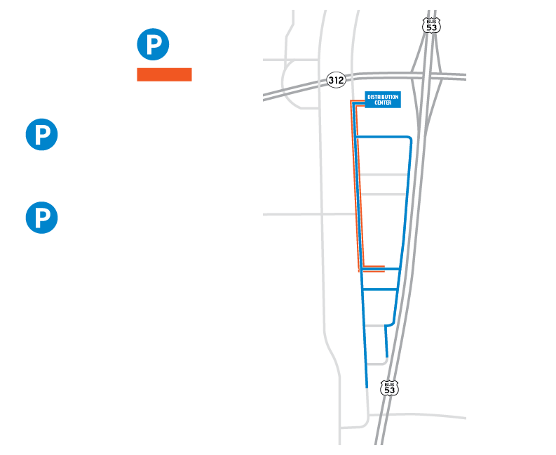 Park at the Distribution Center or on any of the blue-colored streets in the map below, and the shuttle will pick you up along the way.